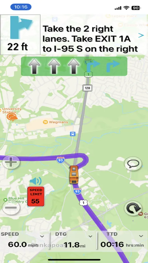 * Provides turn-by-turn instructions with voice with lane guidance.
