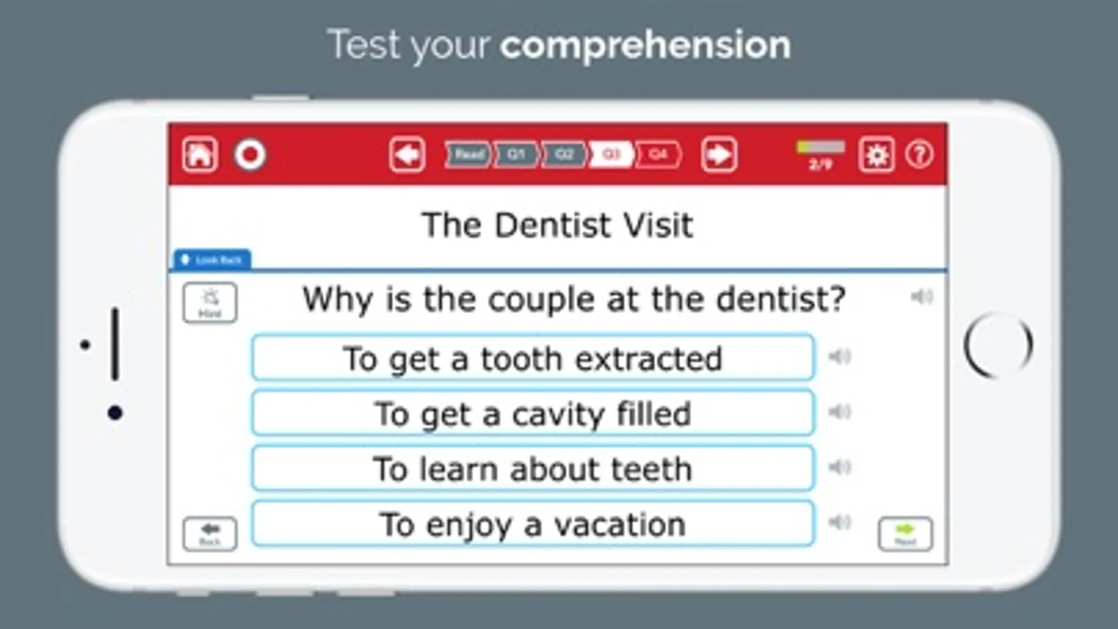 • Look back at the passage any time, or have the relevant text highlighted with a Hint