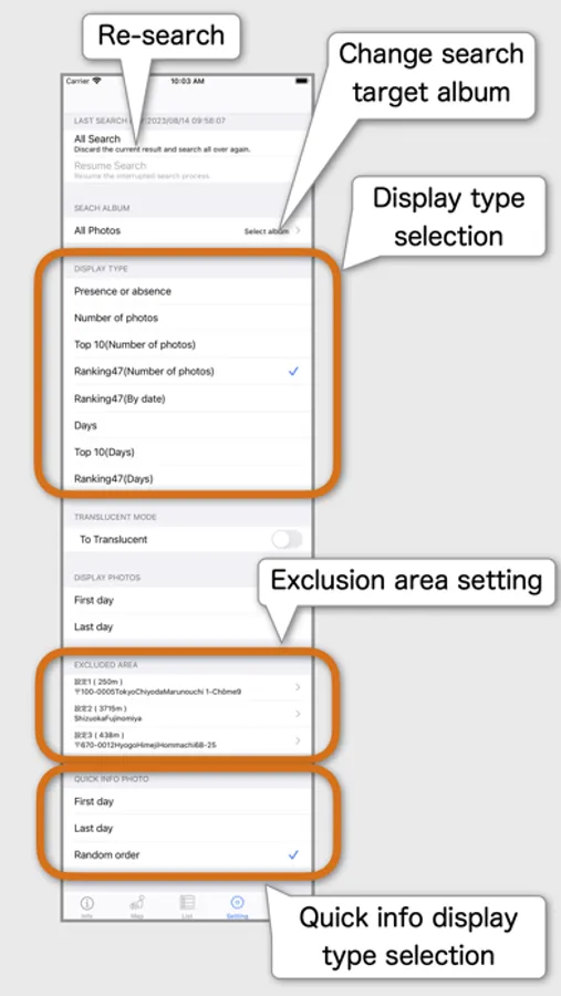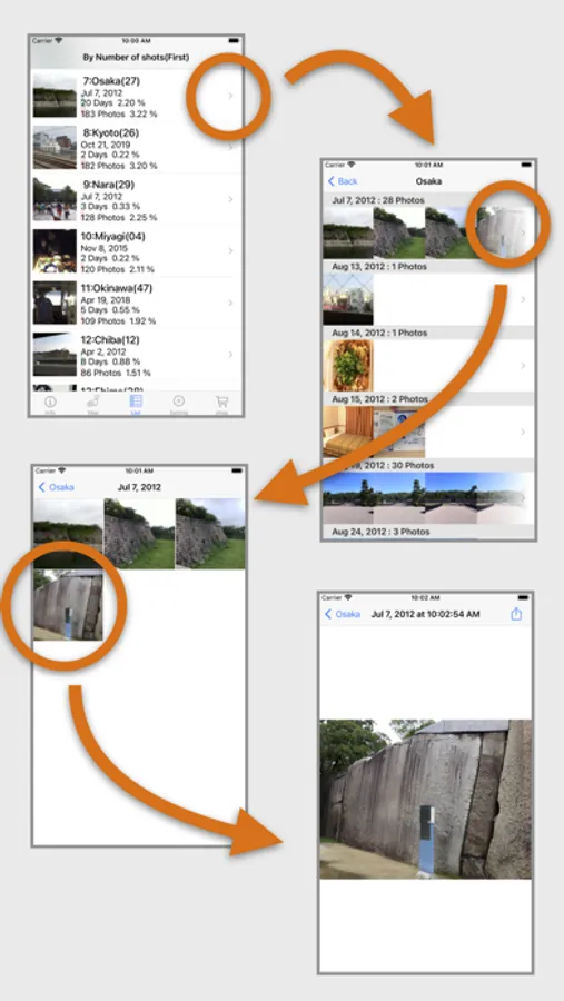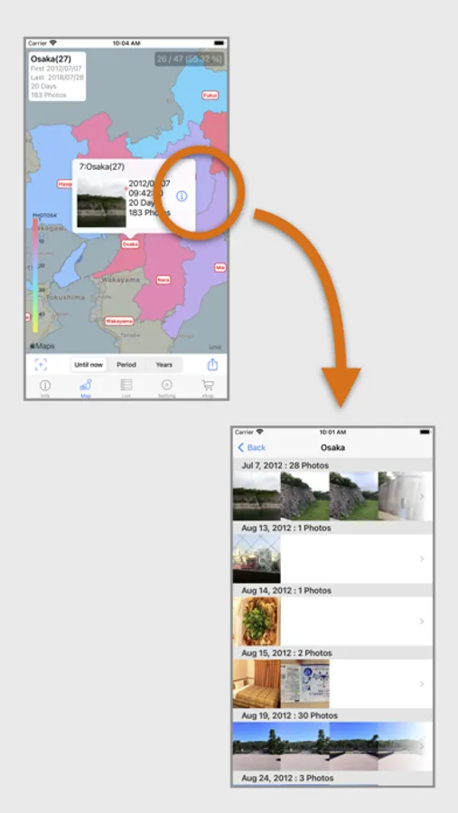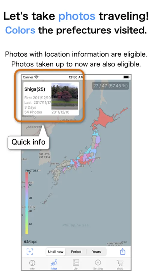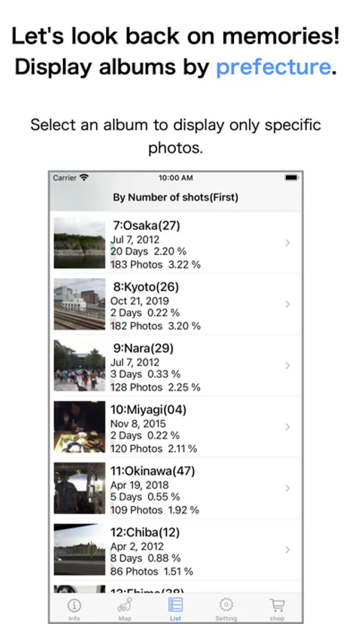 "List" photos, shooting date, number of shots, and number of days are displayed for each prefecture.