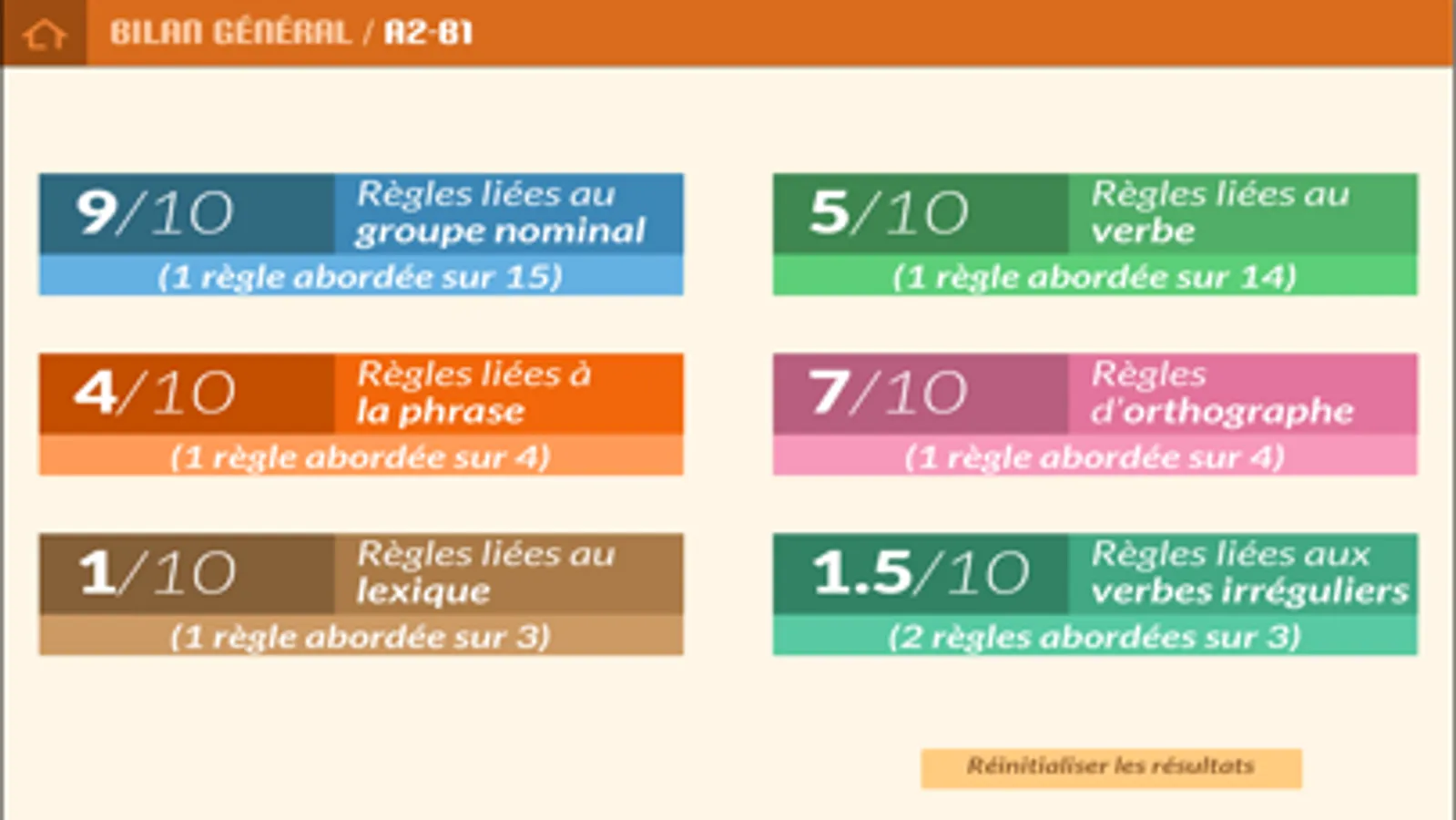 Les exercices sont organisés en 5 grandes catégories :