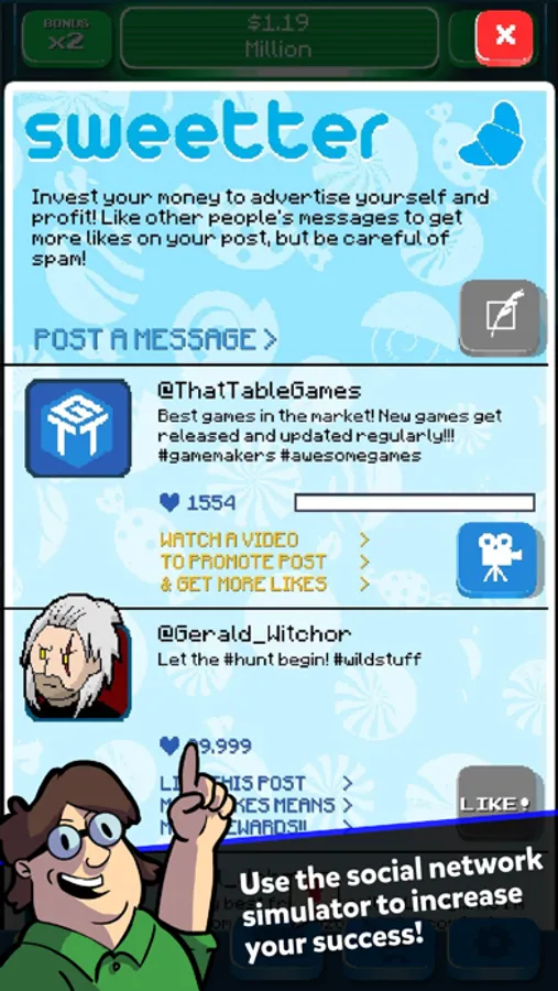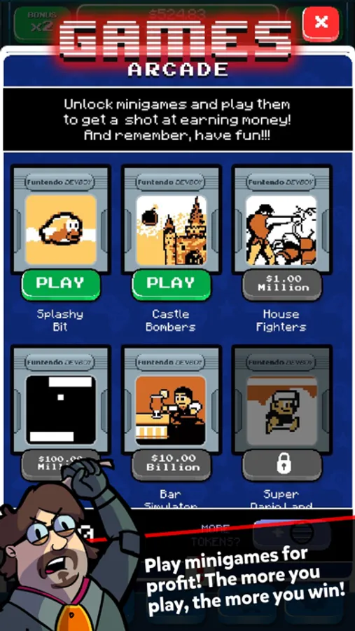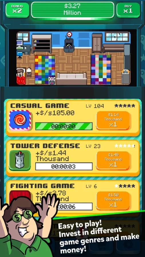 To grow your company, hire new employees, get upgrades, and expand your fan base (as well as potential $$customers$$) with the social media simulator. You can also obtain new resources by earning points from the 10 classic retro games available to play! The world of video games needs a new stand-out personality, a new hero of game design, a new unstoppable gaming ruler: it needs someone like YOU!