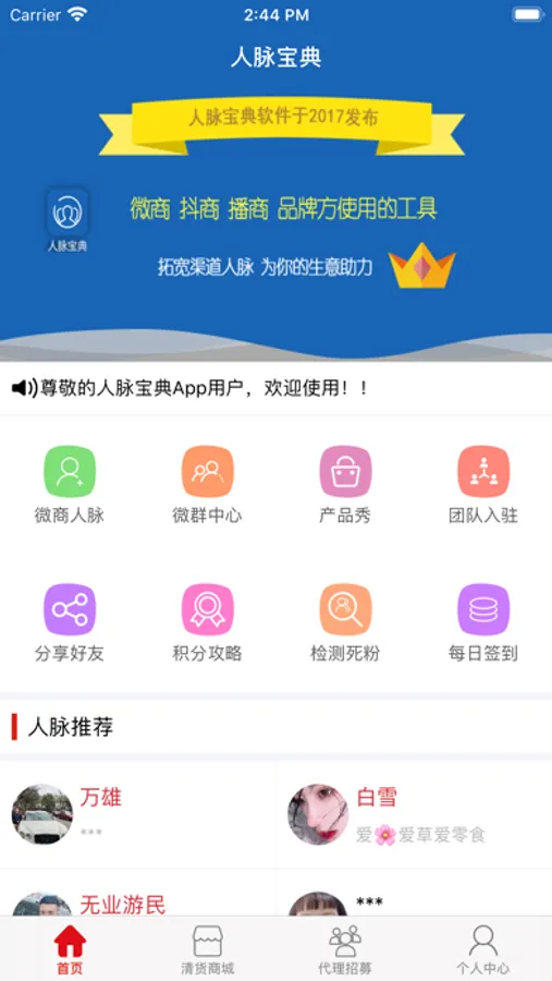 人脉宝典App主要为微商、抖商、视商、播商、品牌商等团队直达精准客源、区域行业人脉导入、产品推广展示、团队入驻自动招募代理等服务,超级人脉宝典人脉助手,让微商生意不再难做,同时还提供在线免费清理僵尸粉功能,让微商生意不再难做,在这里常用的微商工具都可以轻松使用。人脉宝典app还可以向他人学习微商转型新零售销售经营方法,人脉宝典商商家的出货圣地,创业小白找项目找厂家货源的工具,真正的人脉大师微商管家,找人脉、找代理、拓客引流客源就使用人脉宝典app。