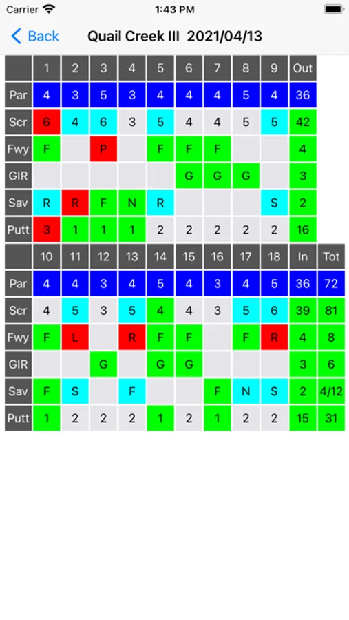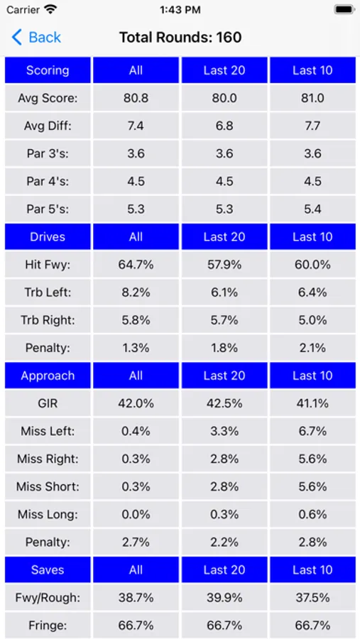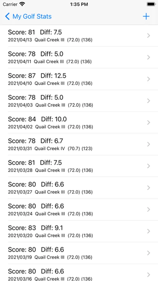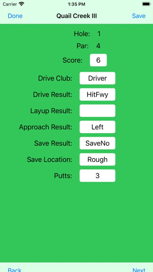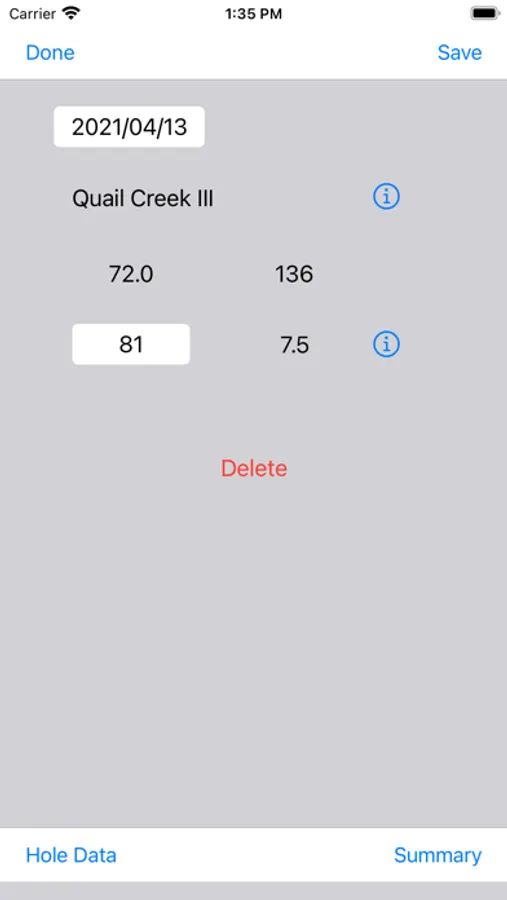 Enter a course with course rating and slope. Then enter a score. Click " Hole Data" and enter statistical data for each hole. Return to Score screen and click Round Summary.
