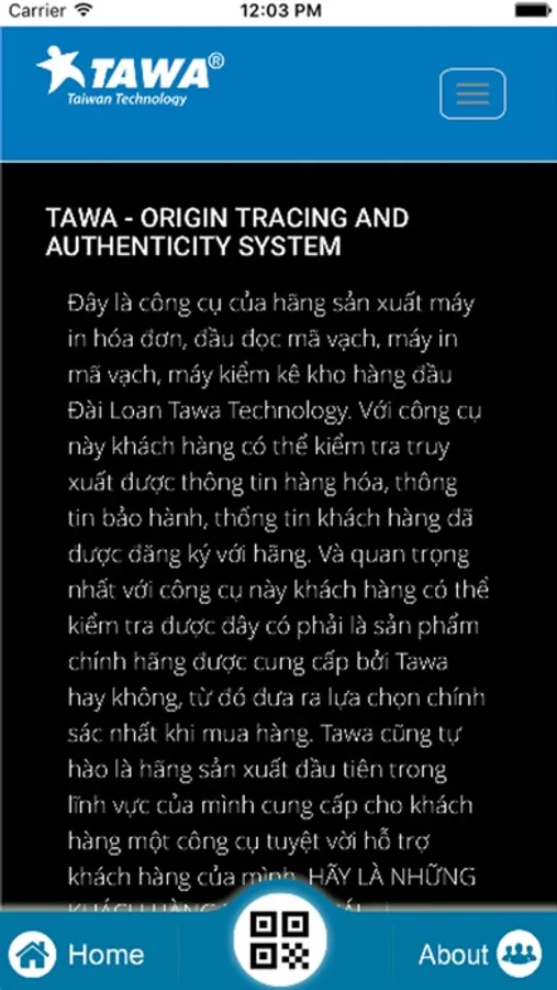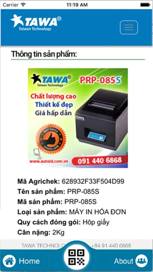 Đây là công cụ của hãng sản xuất máy in hóa đơn, đầu đọc mã vạch, máy in mã vạch, máy kiểm kê kho hàng đầu Đài Loan Tawa Technology. Với công cụ này khách hàng có thể kiểm tra truy xuất được thông tin hàng hóa, thông tin bảo hành, thống tin khách hàng đã được đăng ký với hãng. Và quan trọng nhất với công cụ này khách hàng có thể kiểm tra được đây có phải là sản phẩm chính hãng được cung cấp bởi Tawa hay không, từ đó đưa ra lựa chọn chính sác nhất khi mua hàng.