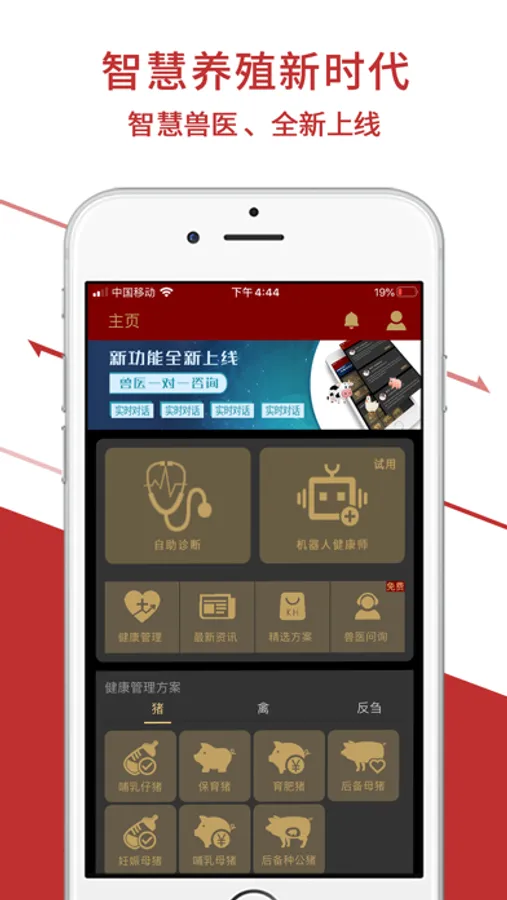 Kinghoo e Farmer is an intelligent breeding software tailored for the animal husbandry industry. It consists of 6 modules, including online automatic diagnosis, selected solutions, optimization of breeding, self-service inquiry, latest information and settings.