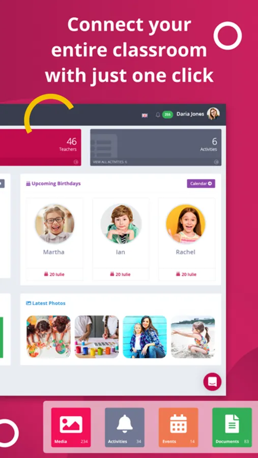 With just a tap of a button, you can get reports on the activity of every actor involved: teacher, parent and child. Get the best out of your data!