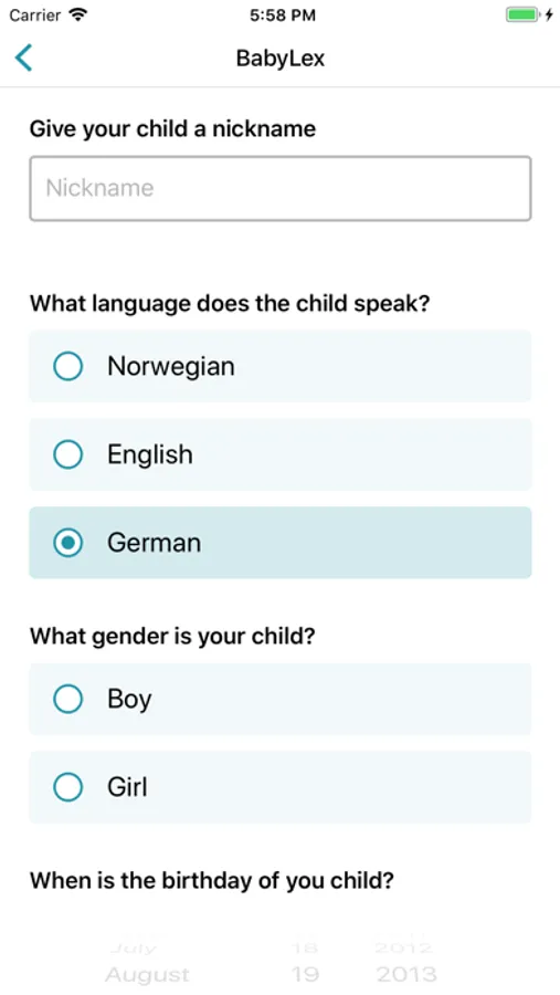 Important disclaimer: This is merely an estimate provided by the app. It is not a clinical evaluation of your child’s language development. We are not doctors, we are researchers who are also parents and want to use our research to allow parents an insight into the development of their child. If you want a clinical evaluation of your child, please ask your pediatrician for contacts to the clinicians who can provide you such an evaluation.