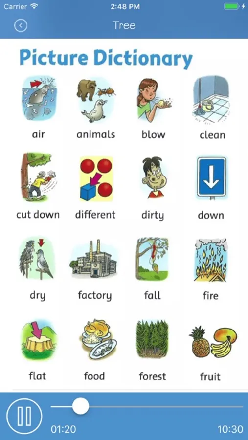 Tree, fruit: parts of a tree like trunk, leaves, flower and seeds...