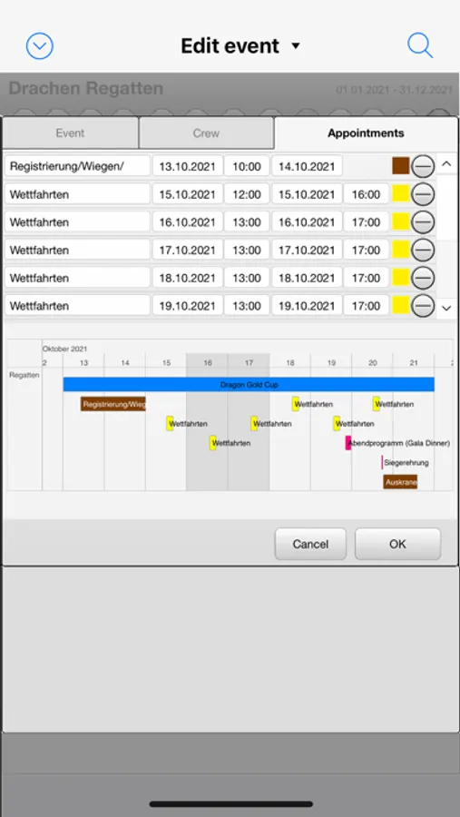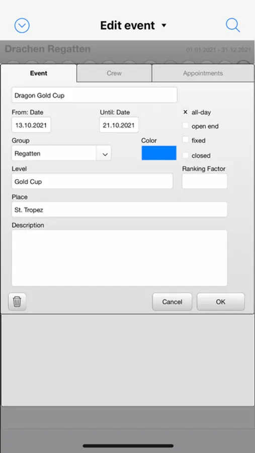 Create an event for each regatta and then schedule all your appointments during this event from the arrival and registration to the races and to the evening program.