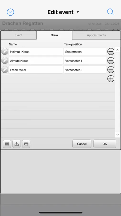 In addition to scheduling, RegattaPlanner offers a crew list in which you can record information on your crew members such as address data and telephone numbers as well as qualifications and possible functions on board.