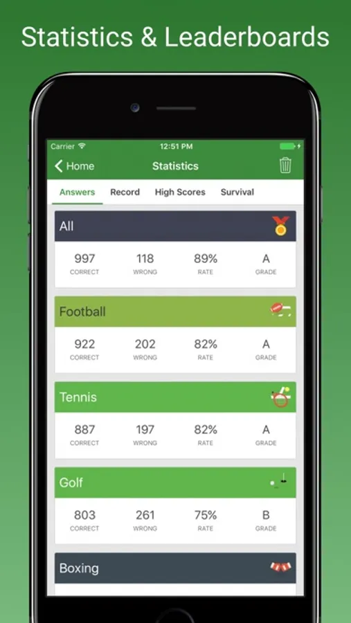 - Questions for Baseball, Basketball, Boxing, Football, Golf, Hockey, NASCAR, Olympics, Soccer, Tennis and UFC