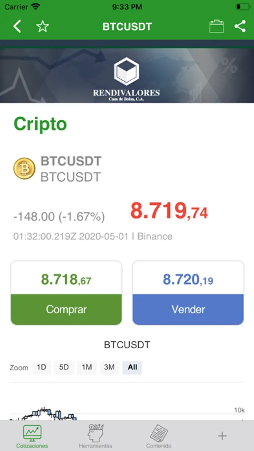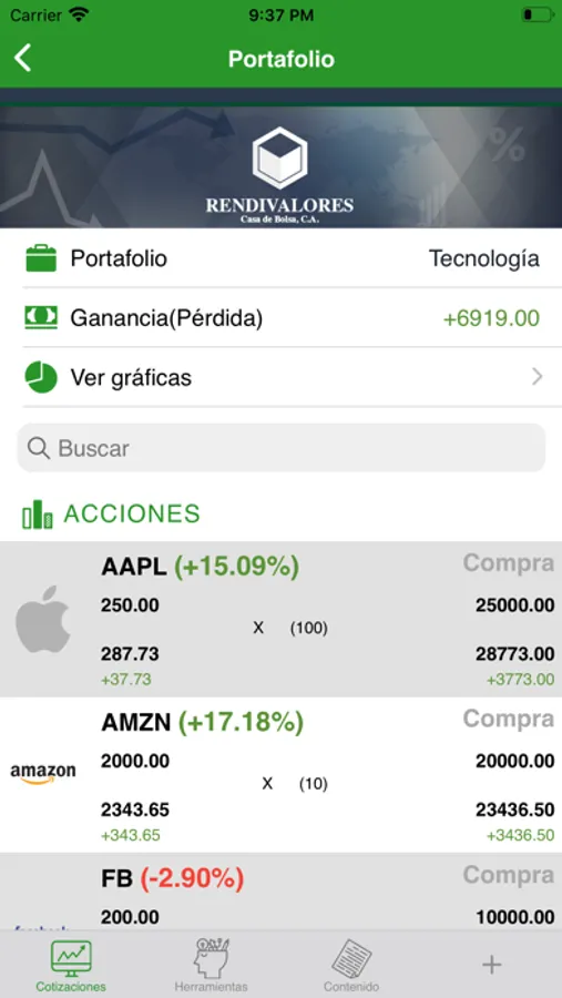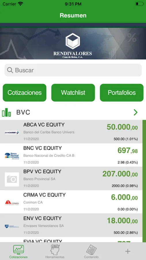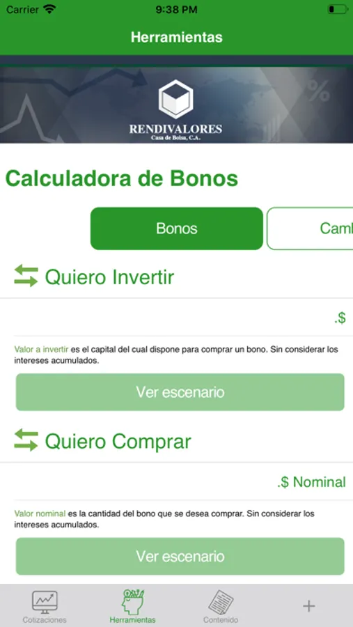 Conoce en tiempo real las cotizaciones de los bonos venezolanos, las acciones de Wall Street, materias primas, monedas y otros indicadores financieros. Recibe noticias, boletines e información sobre los últimos acontecimientos nacionales e internacionales. La aplicación de Rendivalores te permite analizar los distintos instrumentos financieros, evaluar sus características, revisar precios, volumen y estadísticas de mercado, ofreciéndote toda la información necesaria para tomar las mejores decisiones.
