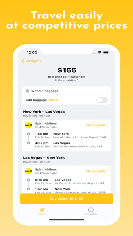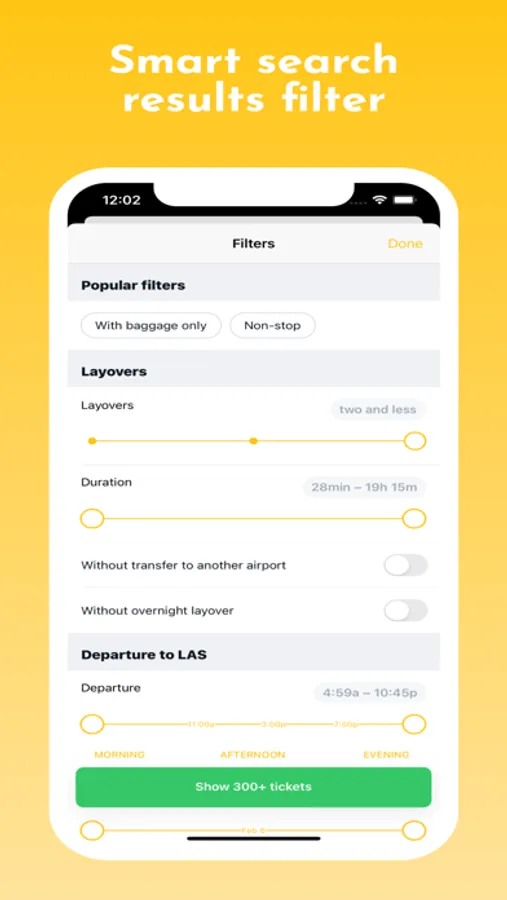 Apply filters to make the search more accurate and quick. You may choose reliable airlines, convenient airports, set the desired flight duration, acceptable amount of transfers, specify baggage availability, a preferable class of service, departure and arrival time.