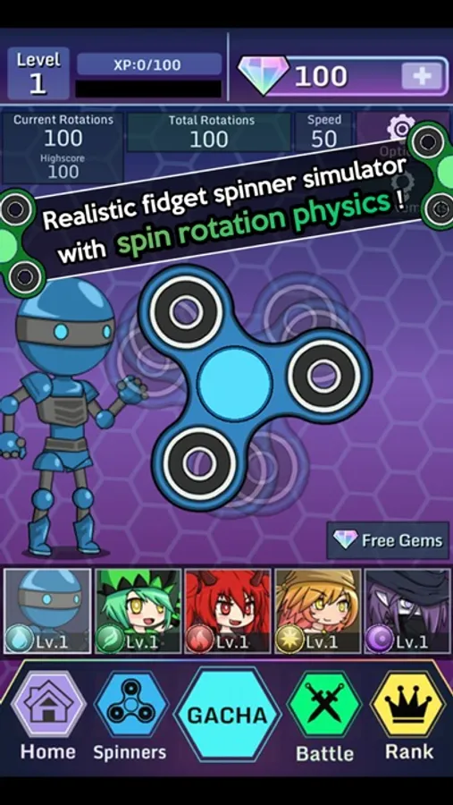 The ultimate fidget spinner app! Collect 100 different anime characters, each with their own unique fidget spinner! This realistic fidget spinner simulator game allows you to use your hands and spin the fidget spinners just like real life! Train your characters to increase their level, attack, and HP!