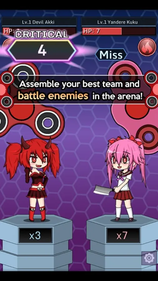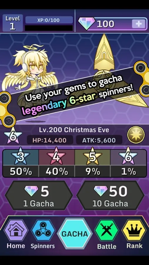 Assemble a team of your favorite fidget spinners and battle others in the Arena! Defeat your opponents to gain gems and use them to collect more fidget spinners! Gacha a wide variety of fidget spinners such as shurikens, scythes, DJ records, and other weapons! Will you be lucky and get a legendary 6-Star Spinner? Join the Anime Fidget Spinner Battle today and spin to win!
