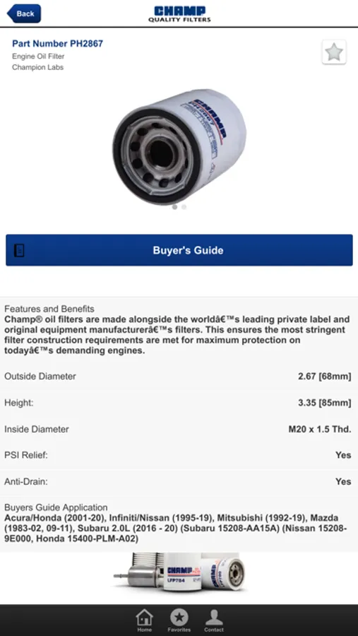 The Champ® Quality Filters mobile application guide provides the latest filter information with quick and easy product search, cross-reference and quick part search functionality with detailed part specifications. You can search by make, year and model or simply scan the VIN tag on your windshield and you’ll find the right part for your vehicle. No more out-of-date paper catalogs - the Champ® application lookup puts the power of a large scale part database right in your hand.