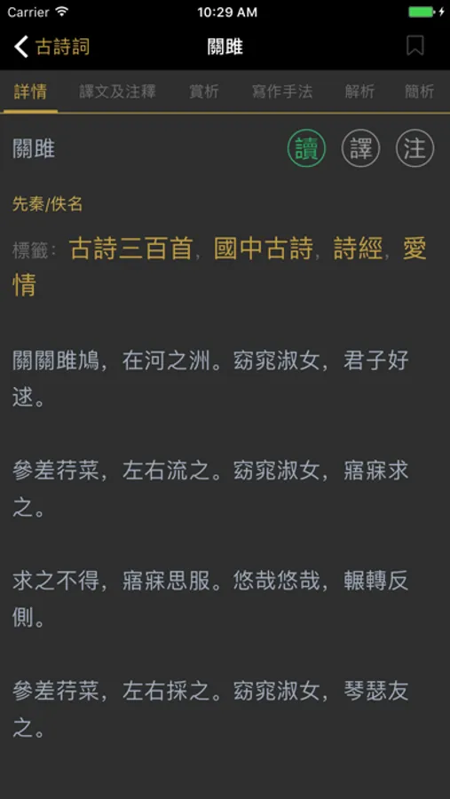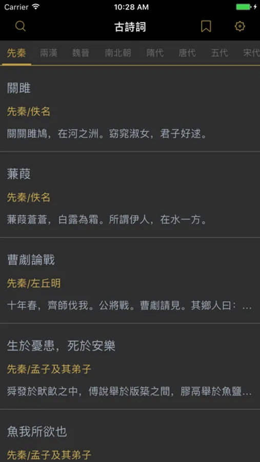 APP共收錄了先秦、兩漢、魏晉、南北朝、隋代、唐代、五代、宋代、金朝、元代、明代、清代共3780首古詩詞,內容覆蓋了唐詩、宋詞、元曲、古詩、楚辭、全唐詩、全宋詞等經典之作,幫助你學習詩詞的注解、釋義和鑒賞。它像一條精神的長江、靈魂的黃河,對人民潛移默化,陶冶情操,哺育了一代又一代的華夏子孫。