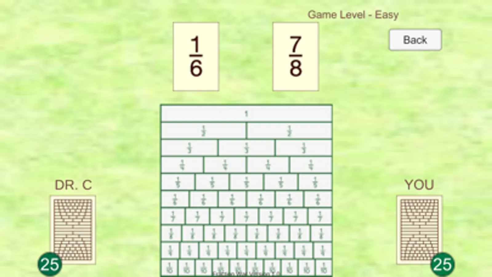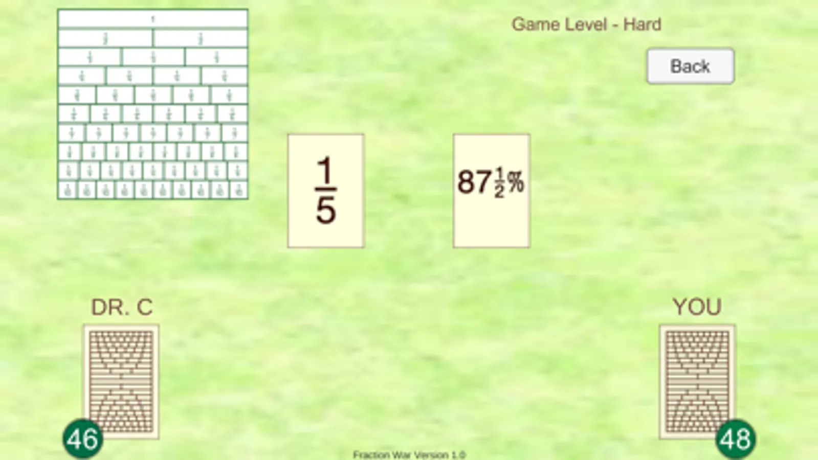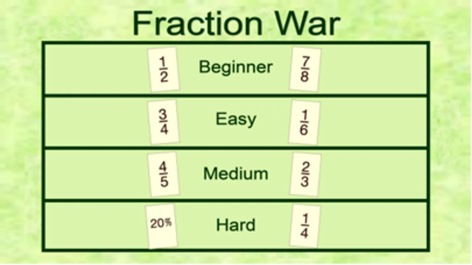 This war game helps players compare fractions while having fun! The beginner game uses halves, fourths, and eighths. The easy level includes thirds and sixths, the medium game adds in fifths and tenths, and the hardest game has percents along with all the fractions.
