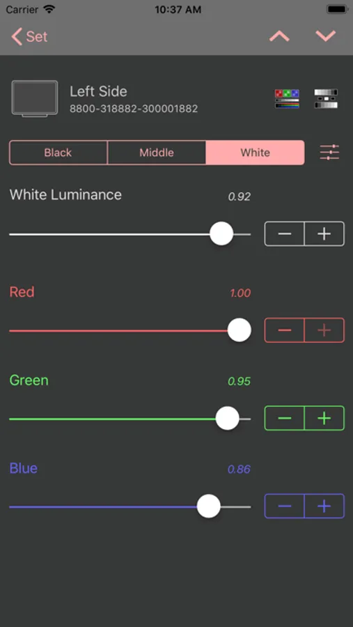 For each group and each screen in a set, you can edit its gamma settings. They are applied instantly to the screen over the network every time you make a change. Just look up at the screen to see the results live.