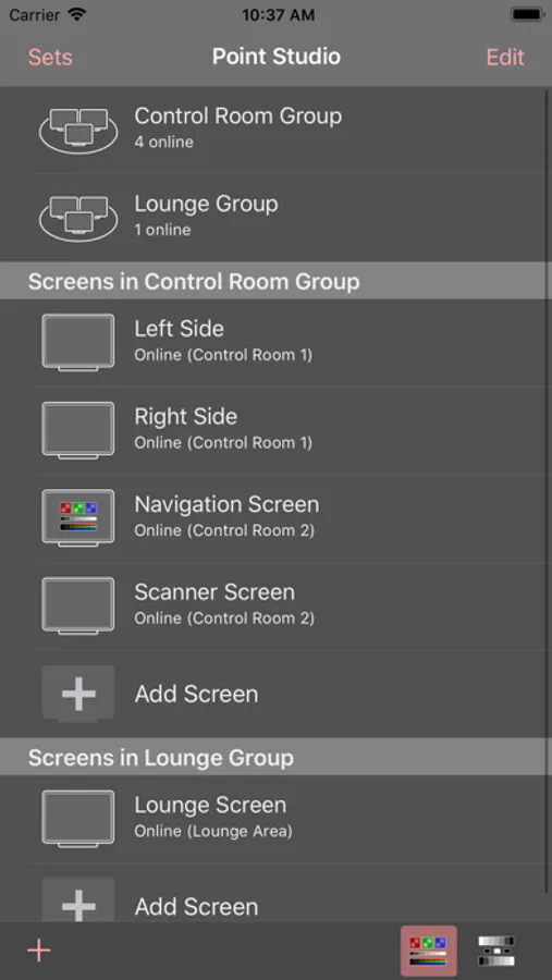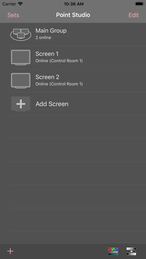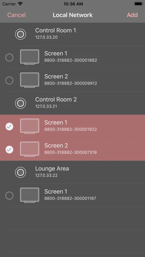 When adding a new screen to a set, you are presented with a list of all the available screens on the local network. Tap a screen in the list to add it to the current set.