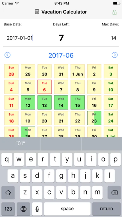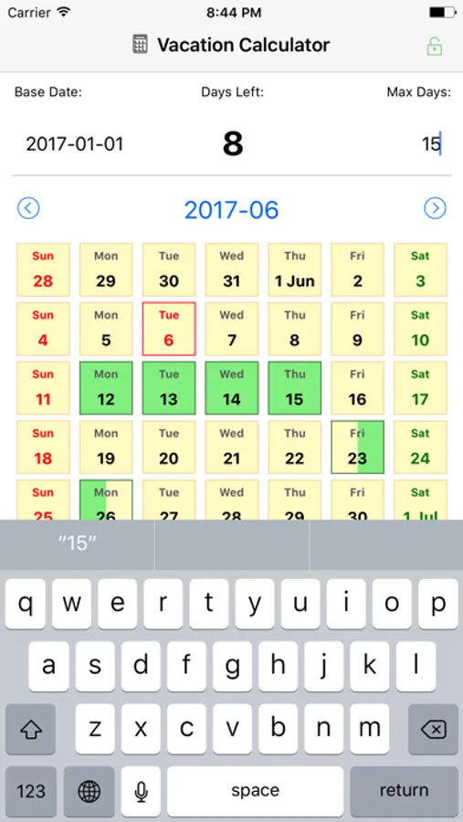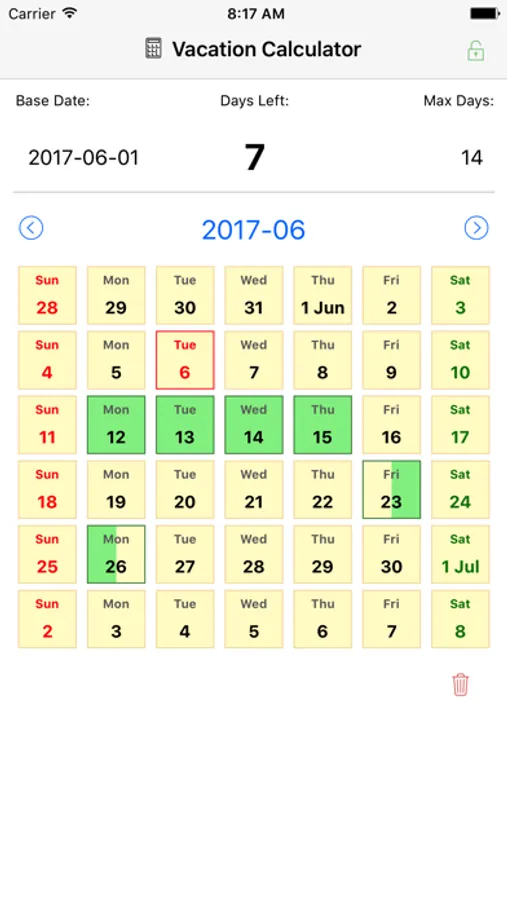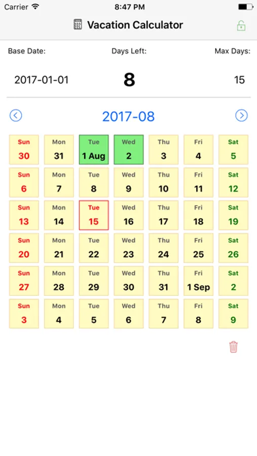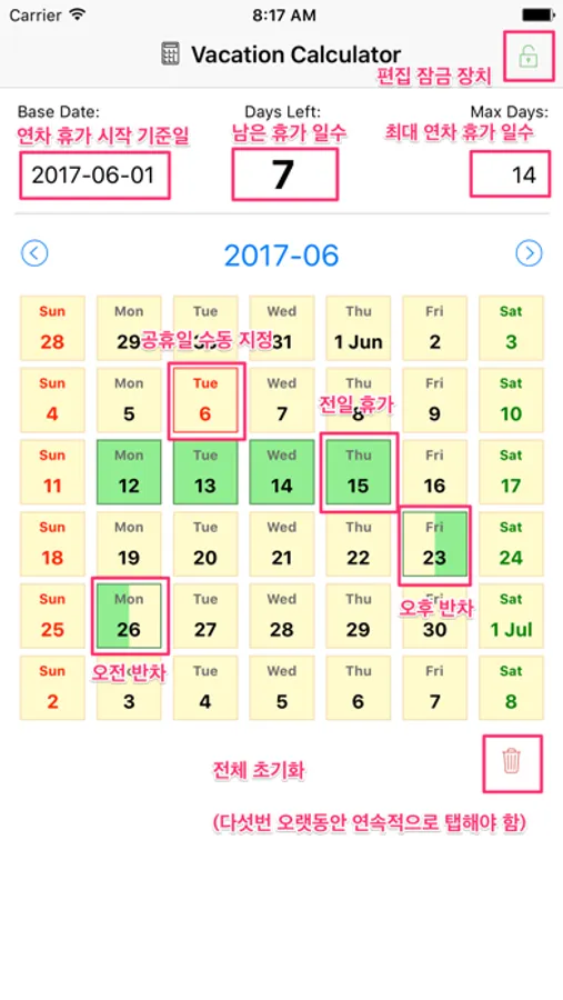 직장 생활을 하다보면 연차 휴가 사용하게 되는데, 한참 휴가를 사용하다 보면 도대체 올해 남은 연차 휴가 일수가 얼마인지 궁금할 때가 있다. 이럴 때 본 앱에서 연차 휴가 사용 시작일(Base Date), 사용할 수 있는 최대 연차 휴가 일수(Max Days)를 입력한 뒤, 월 단위로 달력에 자신이 이미 사용했거나 사용할 연차 휴가를 표시하면 자동적으로 남은 연차 휴가 일수를 계산해 준다. 특히, 전일 휴가, 오전 반차, 오후 반차, 공휴일 지정 등을 사용자가 직접할 수 있다. 휴가를 표시할 때 달력 위에서 해당 날짜 위를 탭(클릭)하면 전일휴가 → 오전반차 → 오후반차 → 공휴일 → 초기상태 순으로 순환되면서 지정된다.