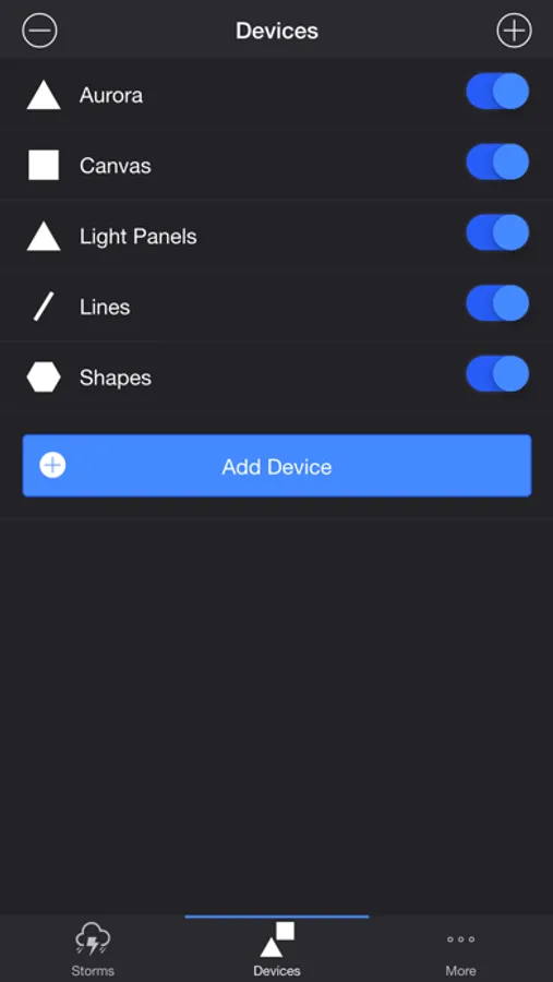Add one or more of your Nanoleaf devices on the Devices tab. Toggle-on the devices you want to use for your thunderstorm light show. To edit a device in the list, swipe the item to the left and tap the pencil icon.