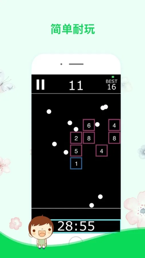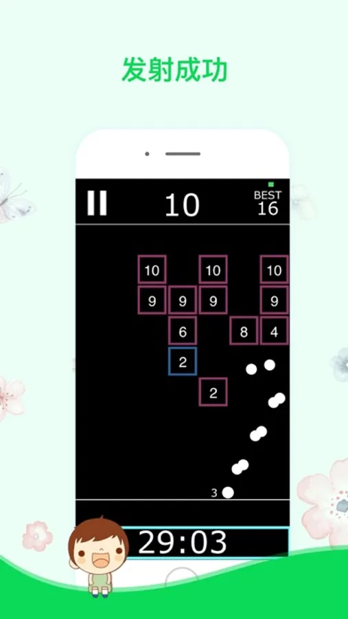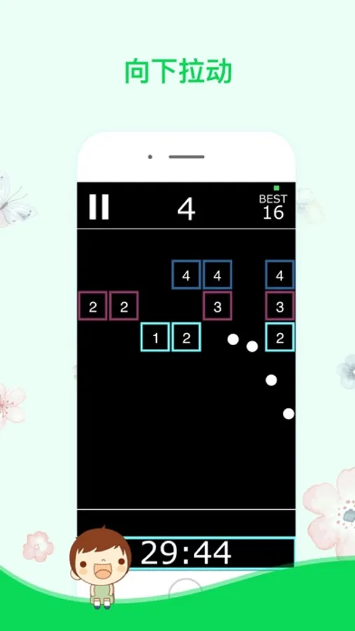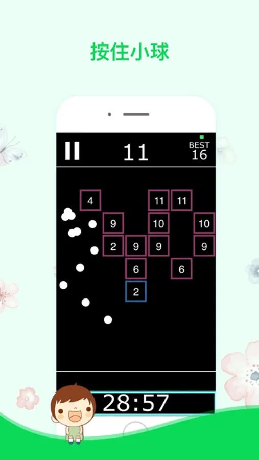 玩法:手指按住小球,向下拉动进行发射,小球碰到方块会消灭方块。