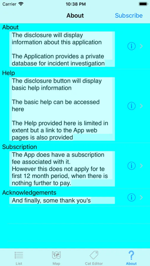 Terms of use for auto-renewing subscriptions are stated at http://incidents.petershevill.com/TermsOfUse.html. They are the standard Apple Terms of Use for subscriptions, please refer to the Apple Store for details, they are summarised below: