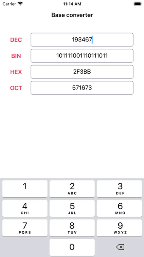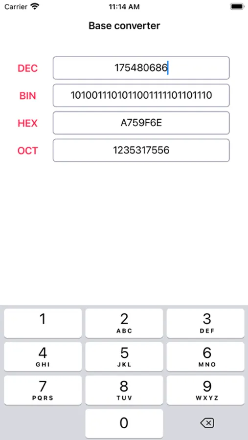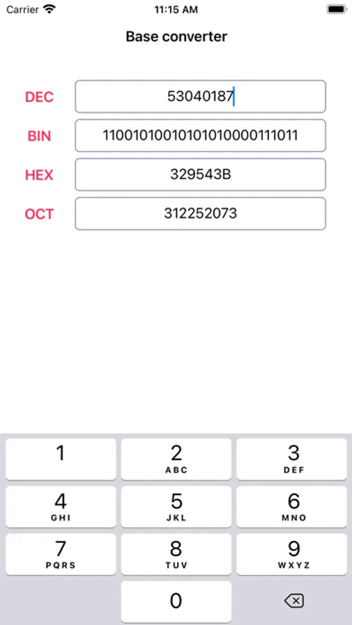 This app converts numbers from decimal numeral system to binary, hexadecimal, octal and vice versa. Accepted values are integers between 0 and 2^31-1 (base ten).