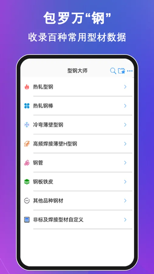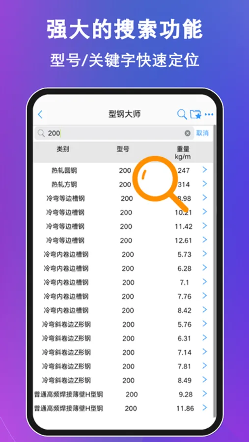 数据来源于最新的国家规范和行业标准,除了钢板,所有的数据都是根据最新的国标文件,全部由手写输入。无论是标识符号还是小数位精度,所有的数据的格式均与规范保持一致,保证数据的绝对可靠。“型钢大师”适用于每一个与钢材打交道的工程师,无论您是土建领域的工程师、钢铁五金专业的工程人员,还是机械、船舶、石油化工方面的从业者。