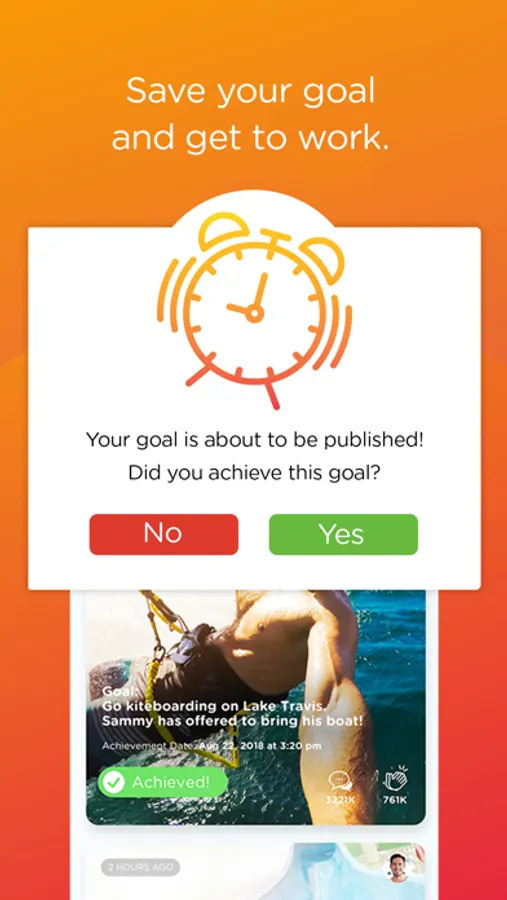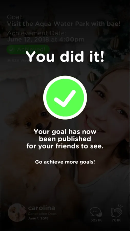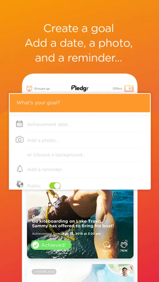 When you set a goal on Pledgr, it locks in your goal permanently and reminds you to achieve it. You can’t take it back once a goal is set, forcing you to be a person of your word and a finisher not a quitter. On the “Achievement Date”, Pledgr will send you a notification to check if you achieved your goal. Your goal then gets published with an "Achieved" or "Unachieved" label respectively!
