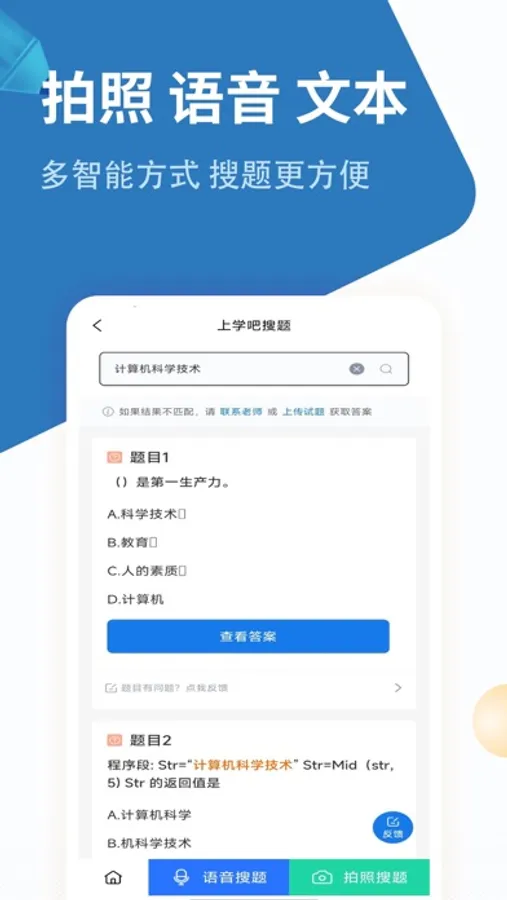 上学吧找答案APP不仅支持文字输入、而且支持语音搜题和拍照搜题,这样最大程度方便了用户使用,提高了用户的使用效率。