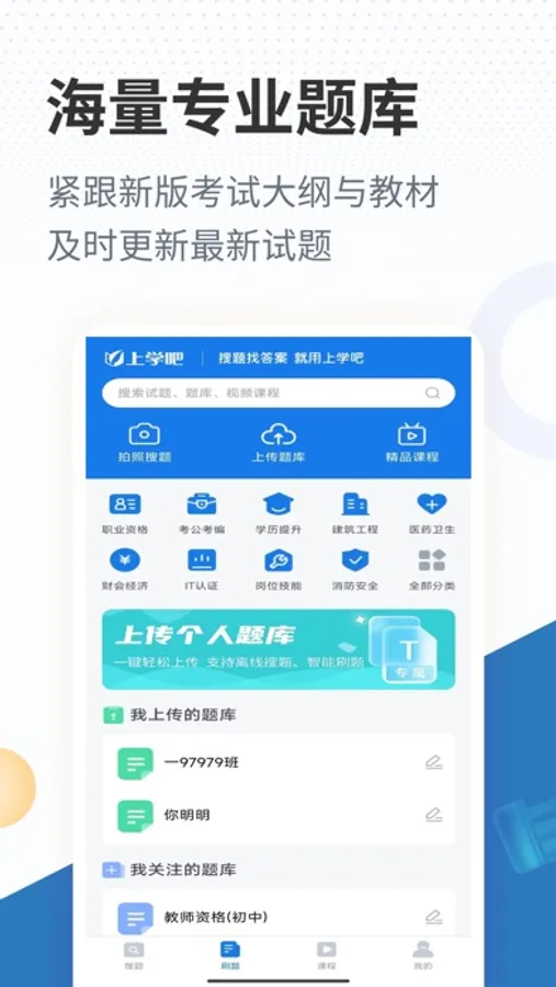 上学吧全面收录国内财会类、工程类、医学类、资格类、计算机类、学历类、外语类、建筑类等历年真题和模拟题题库,同时涵盖大学课程以及考研题库,都可以在线搜题、做题、交卷、评分等,并支持每日一练、章节练习、错题重做等特色功能。