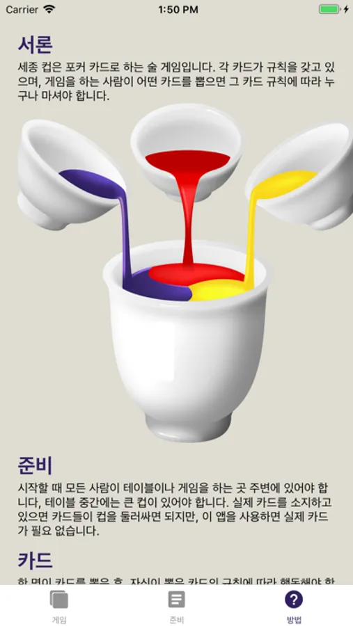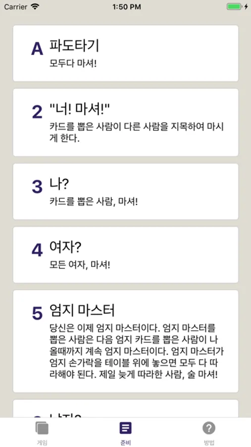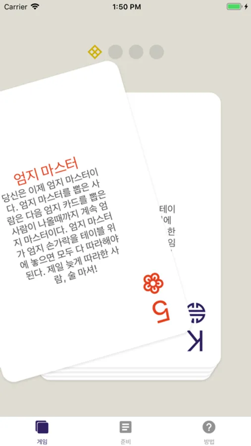 한 명이 카드를 뽑은 후. 자신이 뽑은 카드의 규칙에 따라 행동해야 합니다. 이 앱을 사용하면 자신이 뽑은 카드 밑에 카드의 규칙이 같이 표시되며, 규칙은 변경 할 수 있습니다.