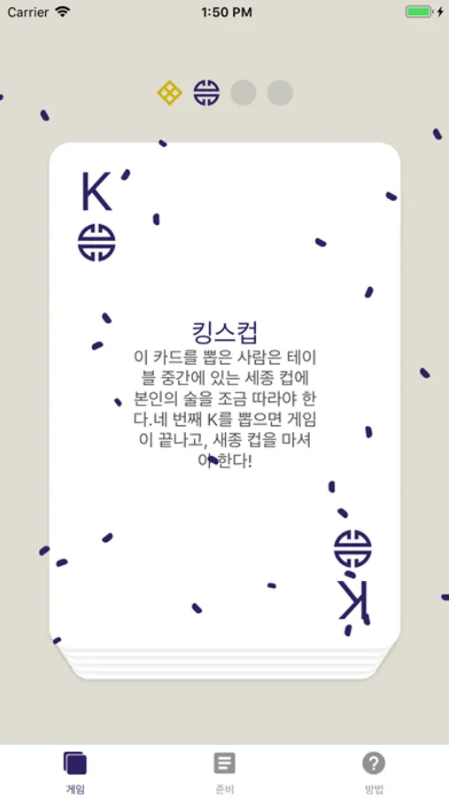 킹 카드를 뽑은 사람은 본인의 술을 테이블 위에 있는 컵에 조금 따르면 됩니다. 마지막으로 네 번째 킹 카드를 뽑은 사람이 컵 안에 있는 술을 모두 원 샷 하면 게임이 끝납니다.