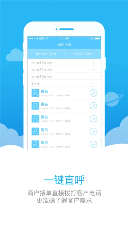 【一键直呼】手机可查看通话记录,包括已接、未接的;并可通过通话记录直接拨打客户电话,联系客户,保障每单都安全靠谱