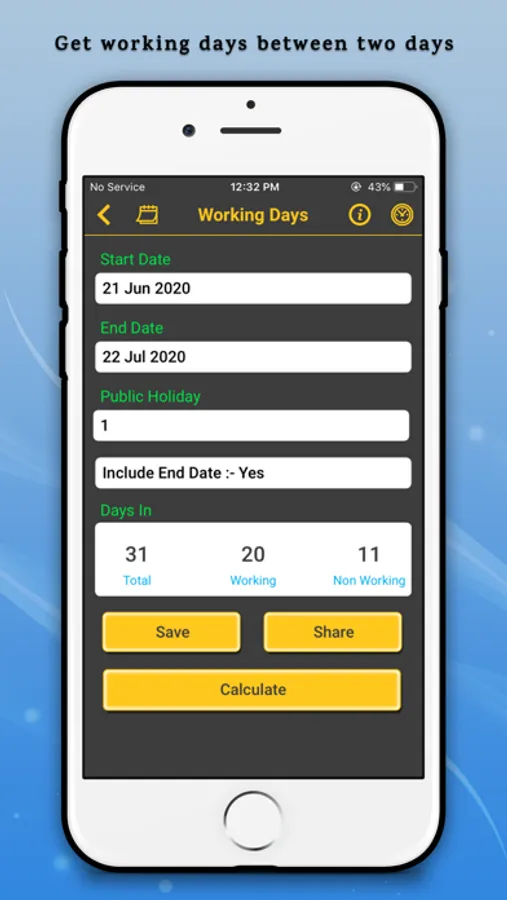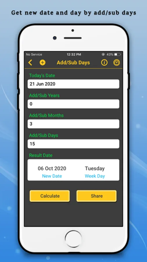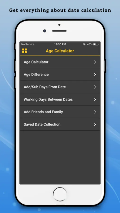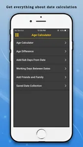 This app helps you to get your current age from today's date, age difference between two persons, new date after adding or subtracting days, working days between two dates.