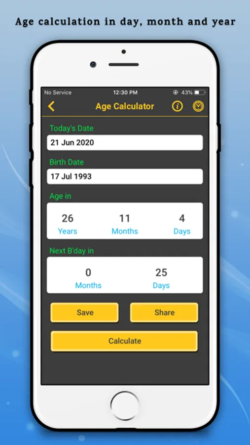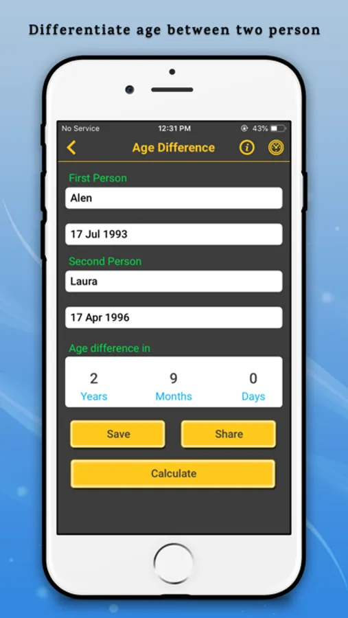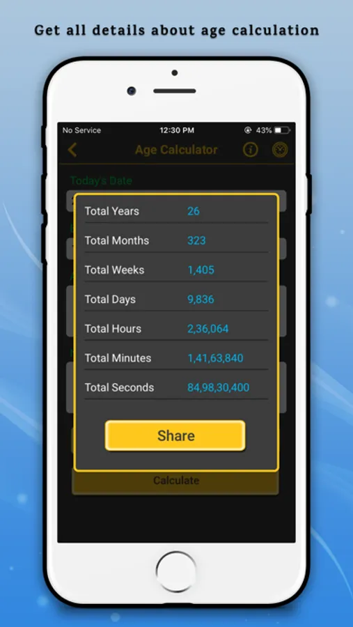 • Get detail about your age in years, months, weeks, days, hours, minutes, seconds