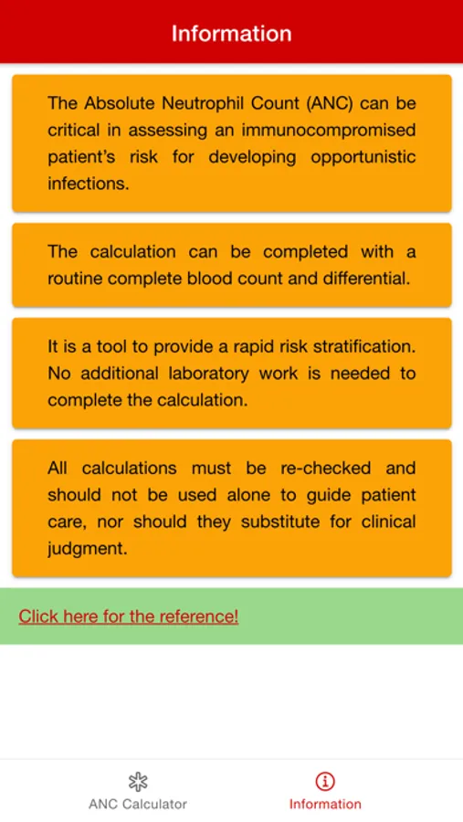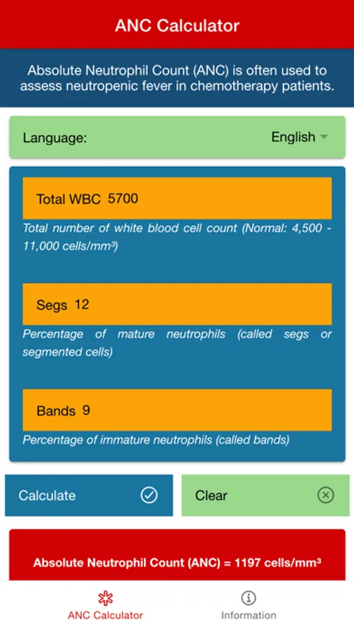 "Absolute Neutrophil Count - Hematology ANC Calculator” is a simple and precise apps to calculate and categorise the Absolute Neutrophil Count (ANC). It is intended for the medical practitioner in the assessment of the risk connected with conditions such as sepsis in patients undergoing chemotherapy.