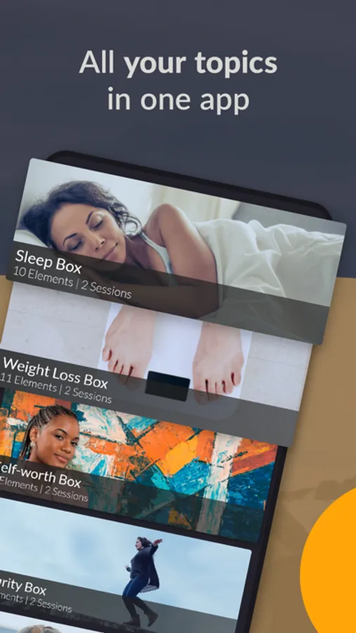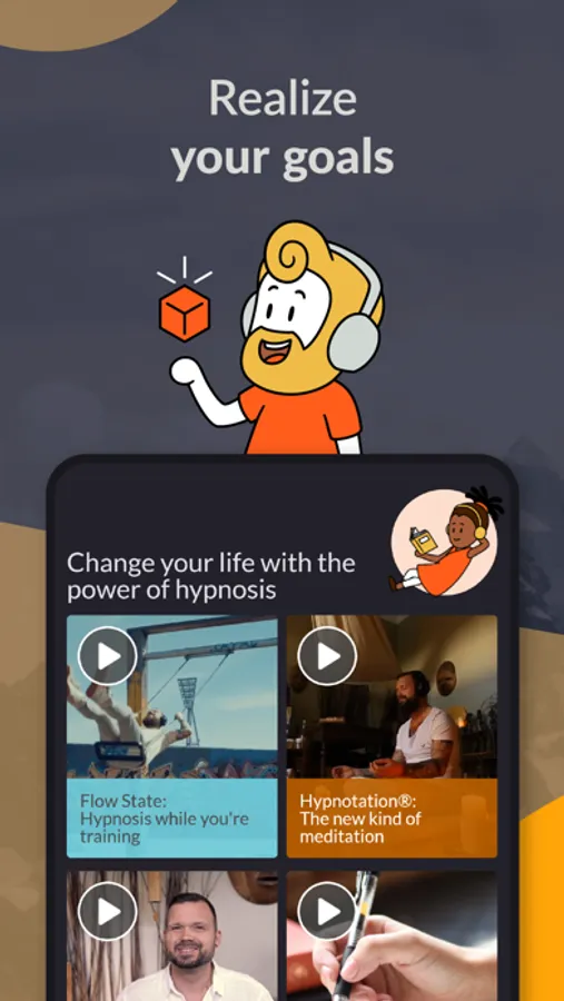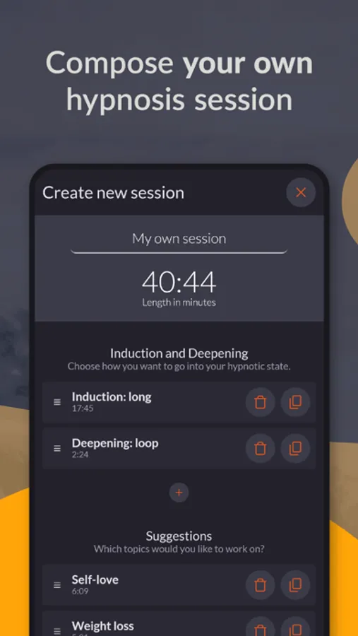 You will get four free sessions on "Relaxation", "Better Sleep", "Better Memory" and "Do it!". You have instant access to nine free suggestion elements, as well as the functions of recording and importing your own audio.