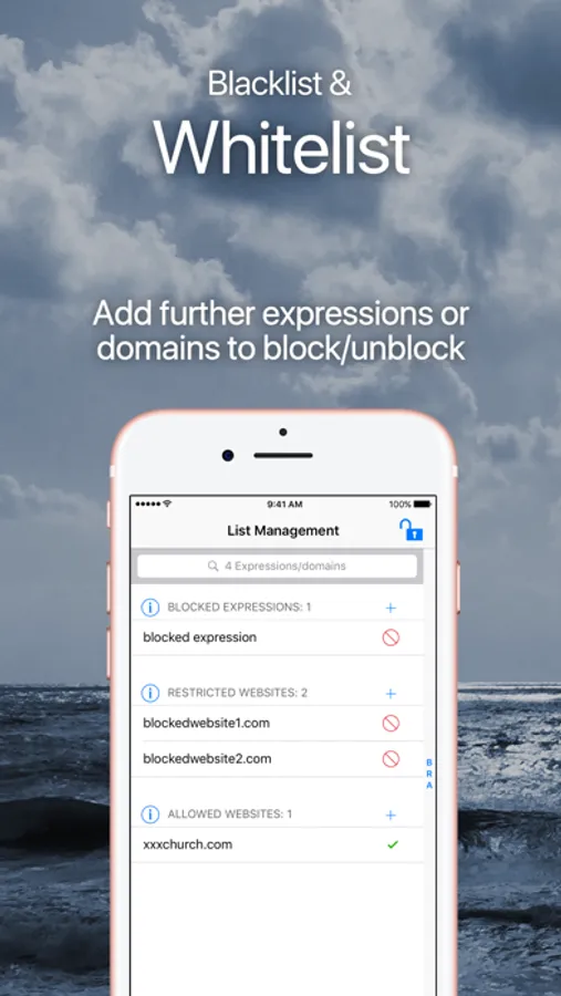 In addition to the blacklists where you can add websites or expressions to be blocked while browsing or searching the web, you can also add for example porn addiction websites to your whitelist to prevent them from being blocked.