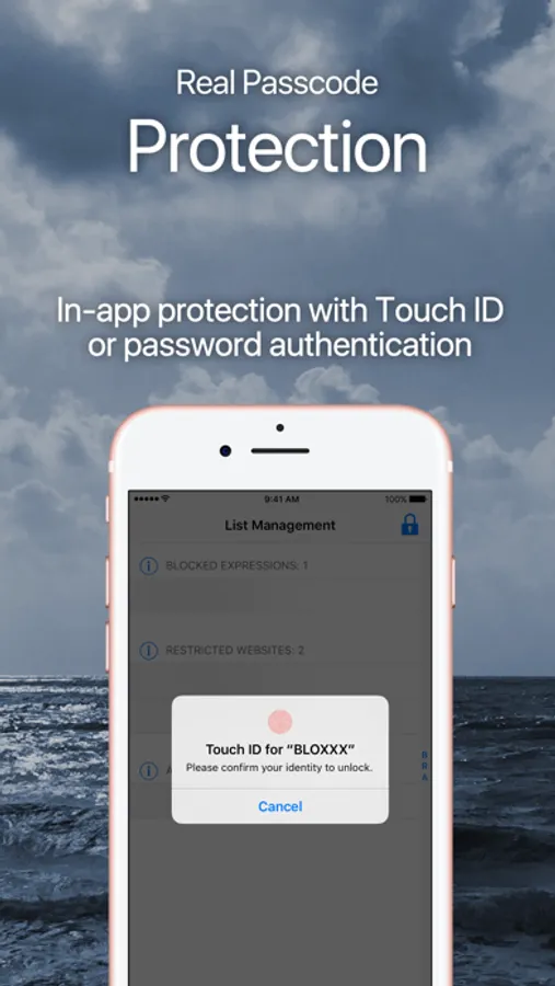 Apart from restrictions settings to keep others from disabling or deleting the app, it offers also in-app protection with Touch ID or custom password authentication to keep others from viewing, editing or deleting entries in your blacklist, whitelist or in your list of blocked expressions.