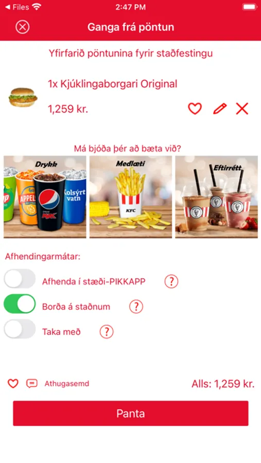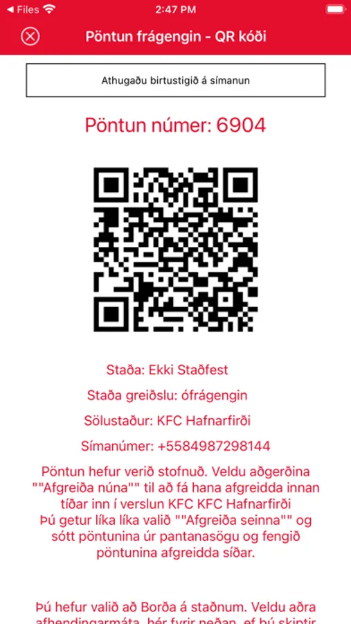 Í KFC appinu getur þú valið áður en þú stígur fæti inn í matsölustaðina okkar hvað þér langar að borða. Þú færð QR kóða sem þú síðan skannar inn á KFC stöðunum okkar. Það sem þú valdir er síðan sent inn í eldhús og nú er bara að bíða eftir að máltíðin sé tilbúin.