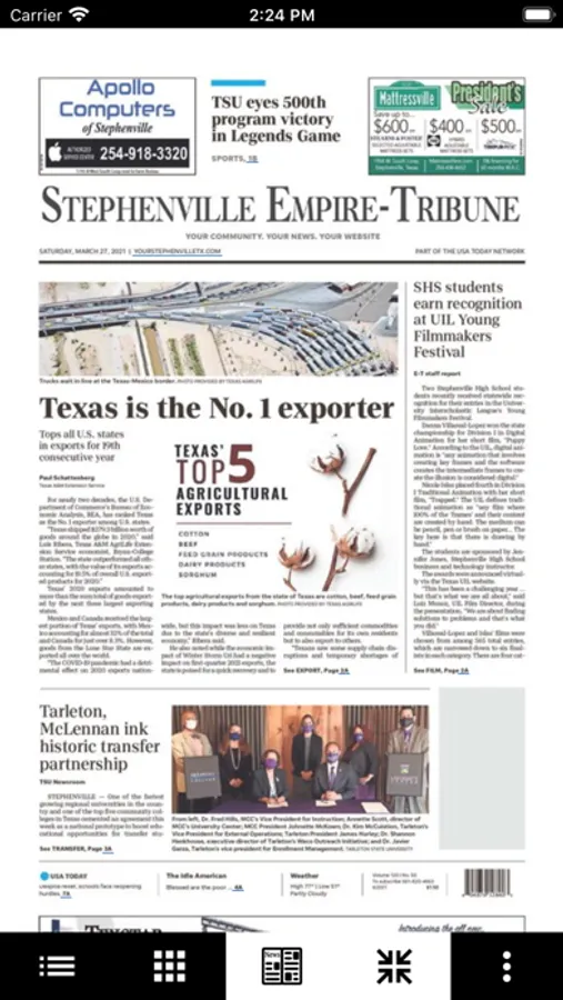 The Stephenville Empire Tribune eEdition is an exact digital replica of the printed newspaper. Readers of the paper can flip through the pages, read stories, photos, and view ads just as they appeared in print.