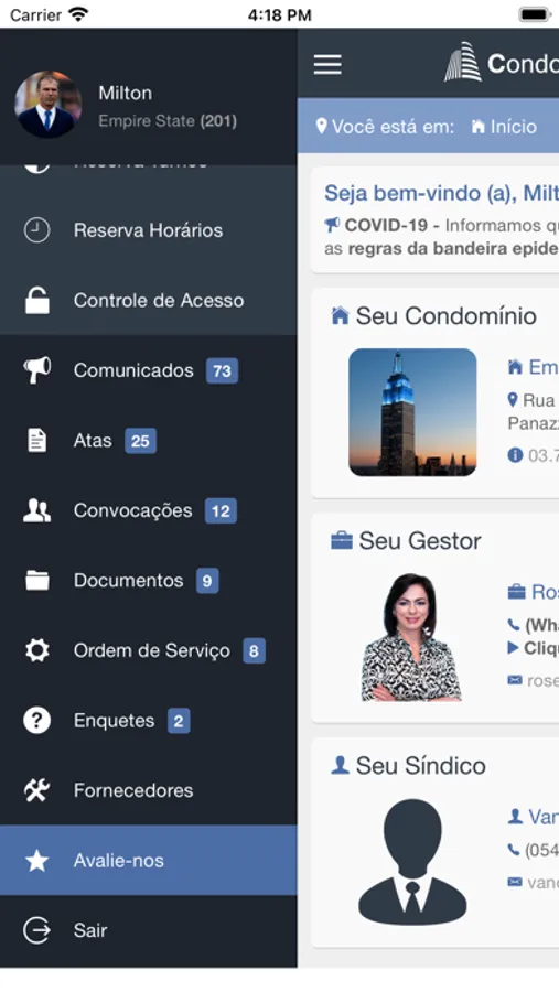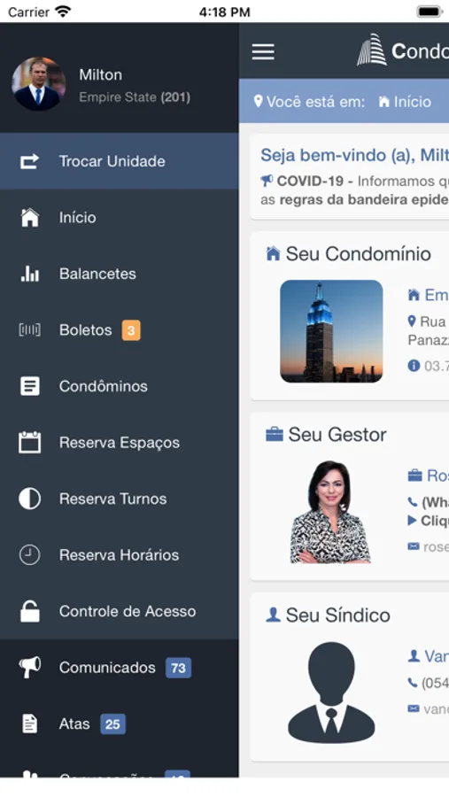 - Informações de contato: É possível visualizar informações cadastrais do Condomínio e também contatos do síndico e gestor;