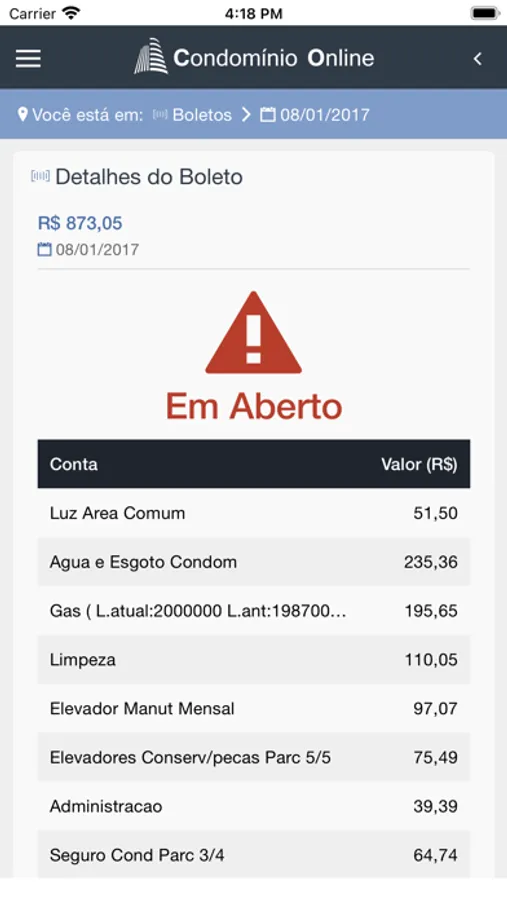 - Cotas condominiais: Disponibilização de todo o histórico de faturas (extrato na tela e documento PDF) - apontando se estão quitadas ou em aberto - inclusive com a atualização das vencidas para a data atual;
