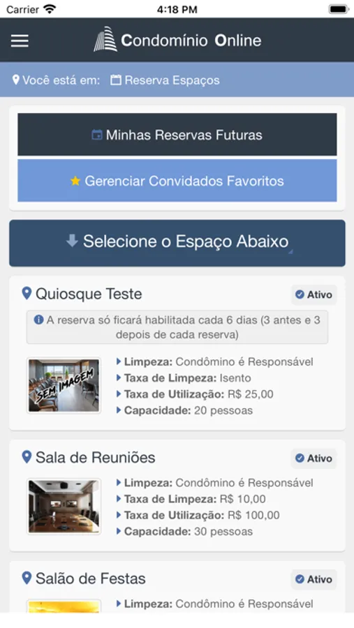 - Reservas: Para os Condomínios que optaram por realizar reservas de espaços online (por dia, horário e também turno – agora com lista de convidados), disponibilizamos a ferramenta para que se possa fazer também via aplicativo (está disponível também na versão web);