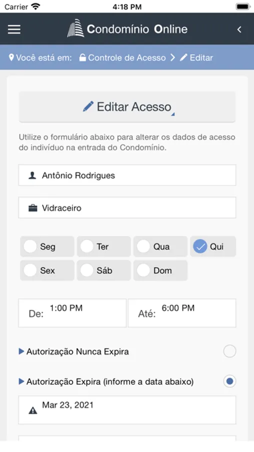 - Controle de Acesso: Caso o Condomínio opte pela habilitação, há possibilidade de cadastrar pessoas com acesso liberado ao Condomínio, caindo diretamente no sistema da portaria (pode ser configurado os dias e horários de livre acesso);