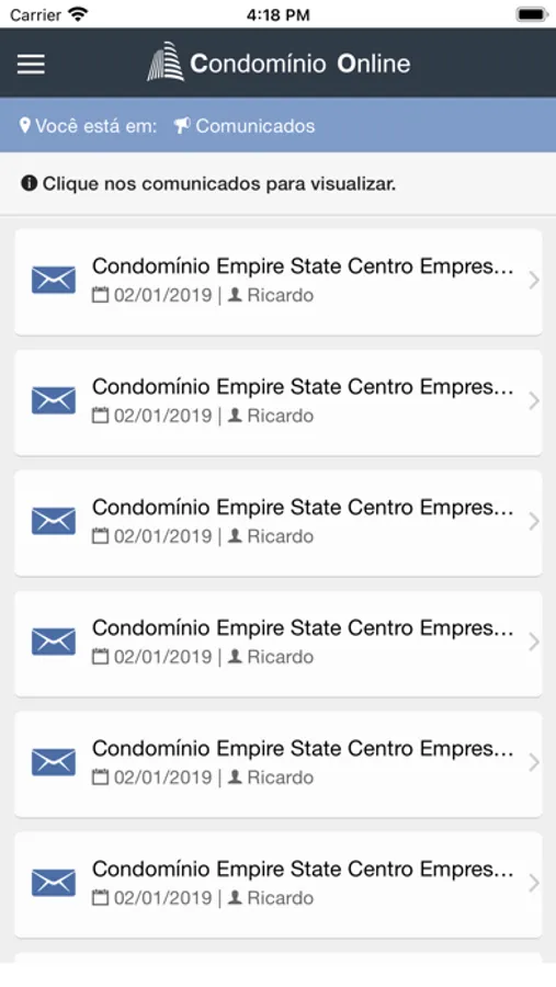 - Comunicados: Comunicações da administradora e do síndico para conhecimento dos condôminos, como circulares internas, aviso de envio de atas, etc (o síndico pode gerar comunicados que também são disparados via e-mail);