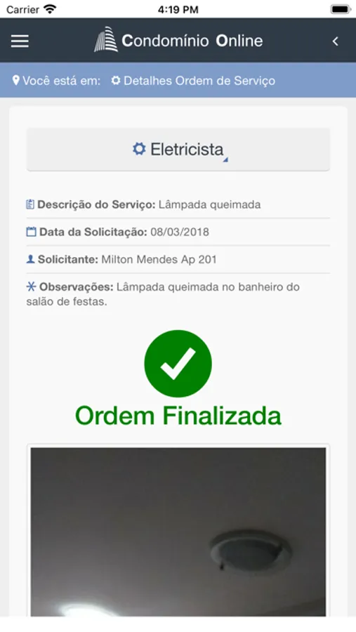 - Ordem de Serviço: Geração de chamado de serviço e acompanhamento da situação por parte dos condôminos;